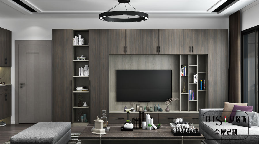 整体家具厂家设置了这款魔法式客餐厅电视柜,一个大大的柜子作为电视背景墙,简单而且大气。这样的背景墙面拥有巨大的收纳功能,根据柜子大小的不同,可放置不一样的日常物品或爱好收藏。