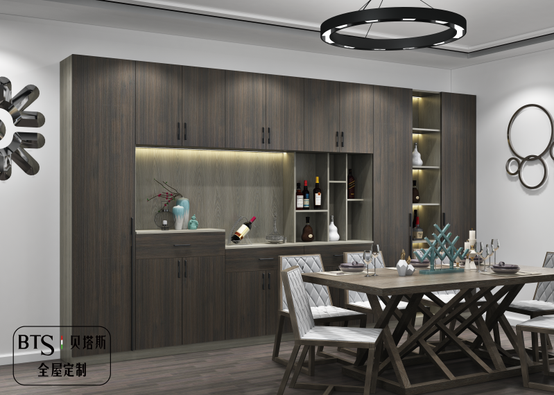 风格是挪威月色,胡桃木的运用,朴实大方,显得稳重,有种坚忍不拔的生命力。细节处理更彰显整套产品的品质。白色门板的弧形处理,犹如森林上空一弯皎洁的新月,仿佛置身月光下的挪威森林。因客厅与餐厅是同一面墙,空间得不到化分,所以吧台与装饰柜结合设计,不但把空间一分为二,同时也多了一个休闲娱乐区。